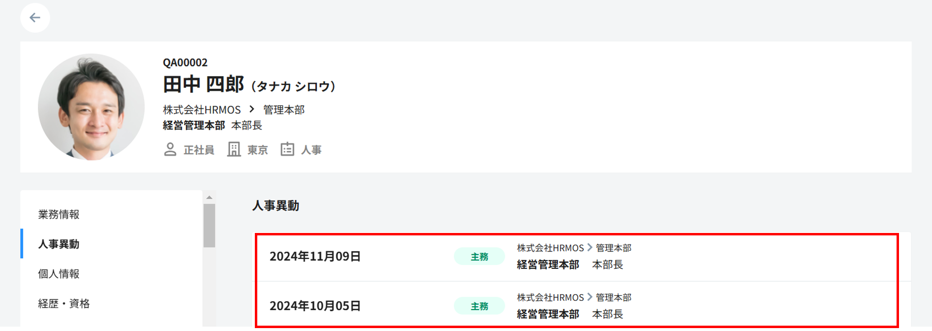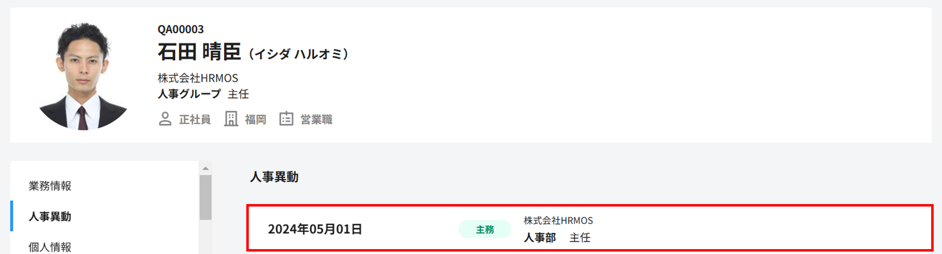 | 操作内容 | 配属、部署情報 | 異動履歴 |