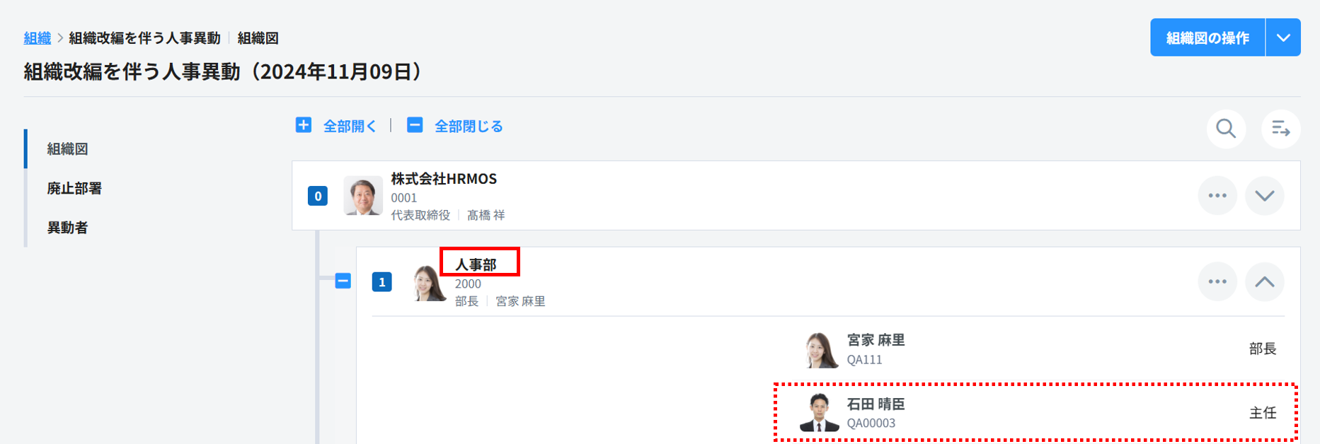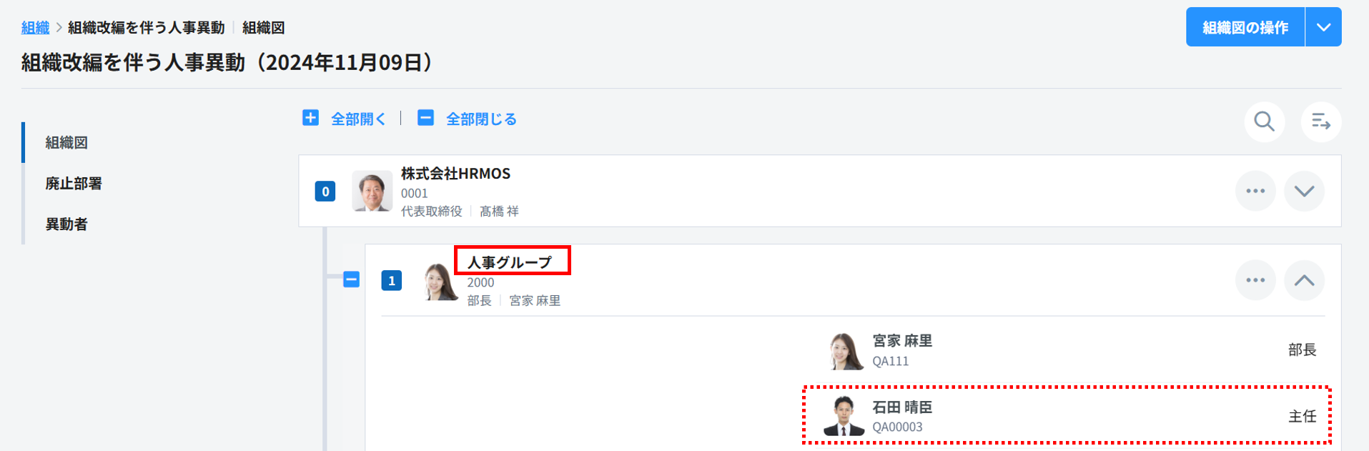 そのため、もし、変更前後の組織で所属が変わらない社員がいる場合、改めて配属させる必要があります。
