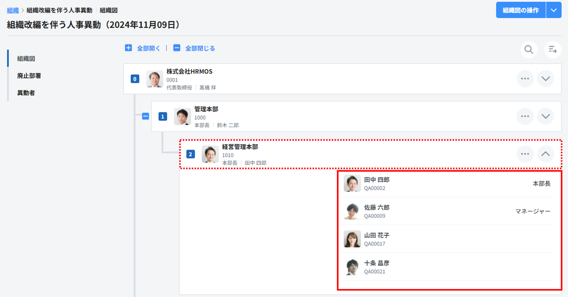 例:2024年11月09日付の組織図にて、「経営管理本部」を廃止した場合