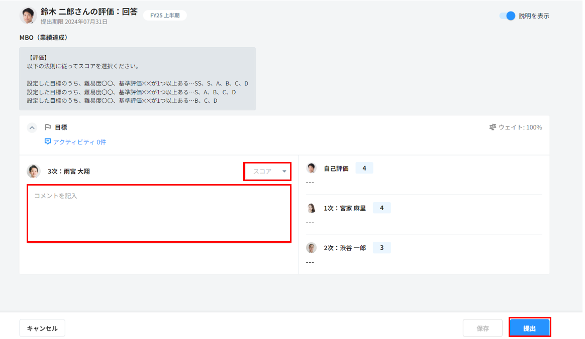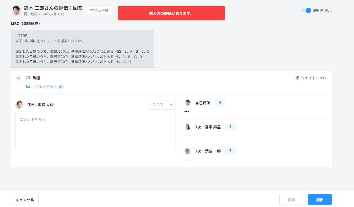 評価時、スコア入力欄がある場合は、スコアの入力は必須となります。