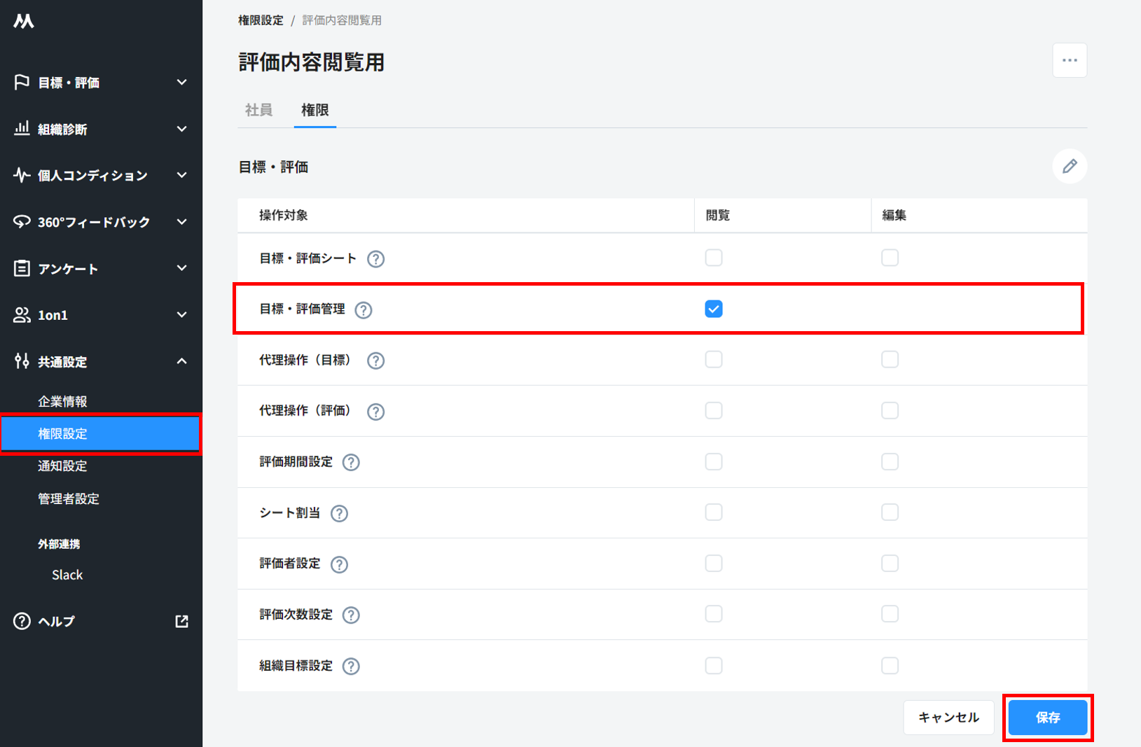 権限設定において「閲覧可」を選択することで、評価内容の閲覧のみが可能となります。