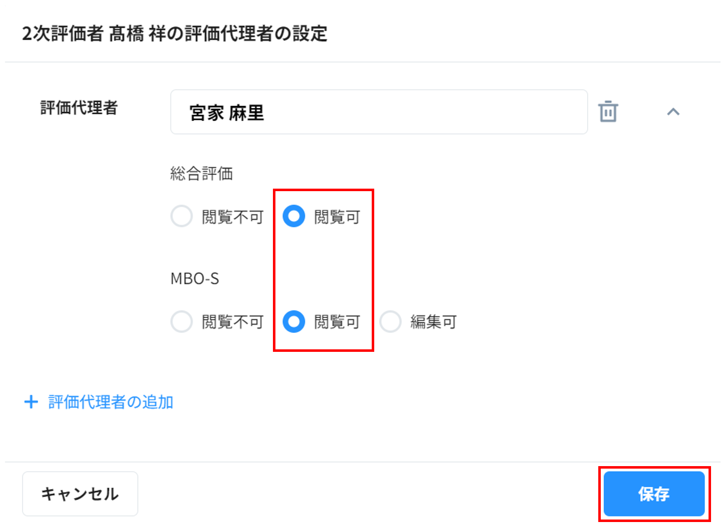 閲覧させたい社員の評価者に対し、「評価代理者」に設定する方法です。