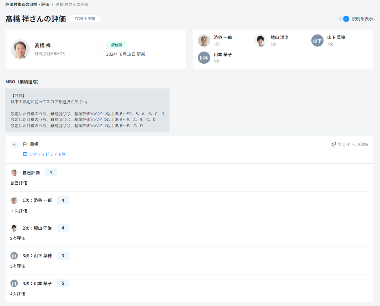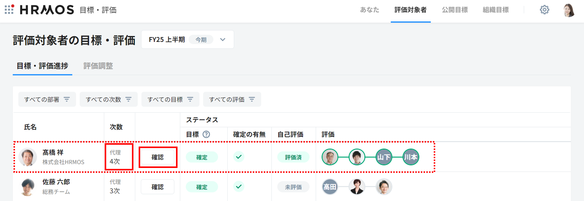 なお、最終評価者(最も次数の高いn次評価者)の「評価代理者」に設定することで、自己評価、及び下位評価者全員の評価内容をまとめてご確認いただくことが出来ます。
