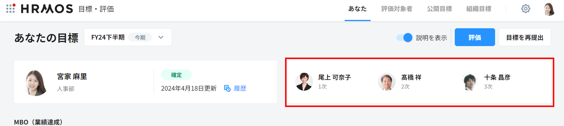 ・被評価者の「あなた」タブの画面上に、次数評価者として表示される点