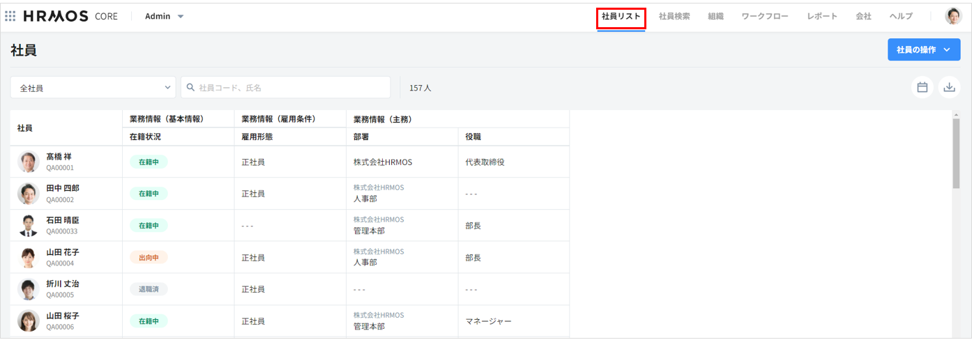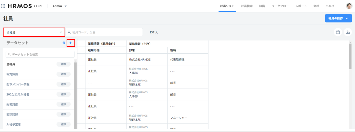 1. Admin(管理画面)の「社員リスト」タブを開きます。2. 画面左上の「全社員」をクリックし、データセット右上の