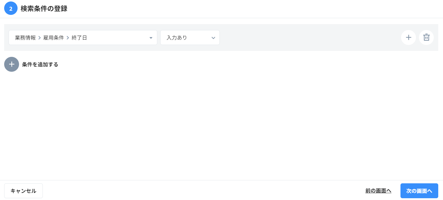 ②表示条件の登録:「業務情報>雇用条件>終了日」「入力あり」
