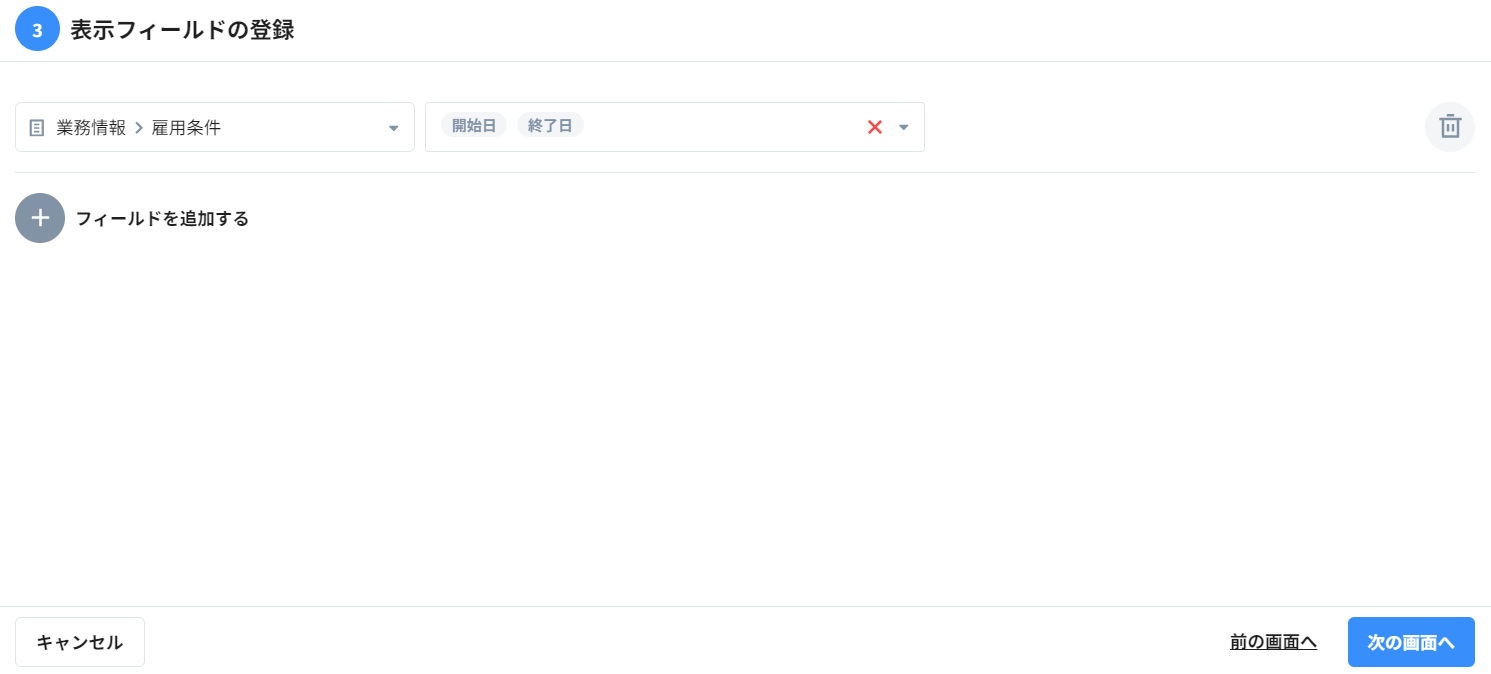 ③表示フィールドの登録:「業務情報>雇用条件」「開始日」「終了日」