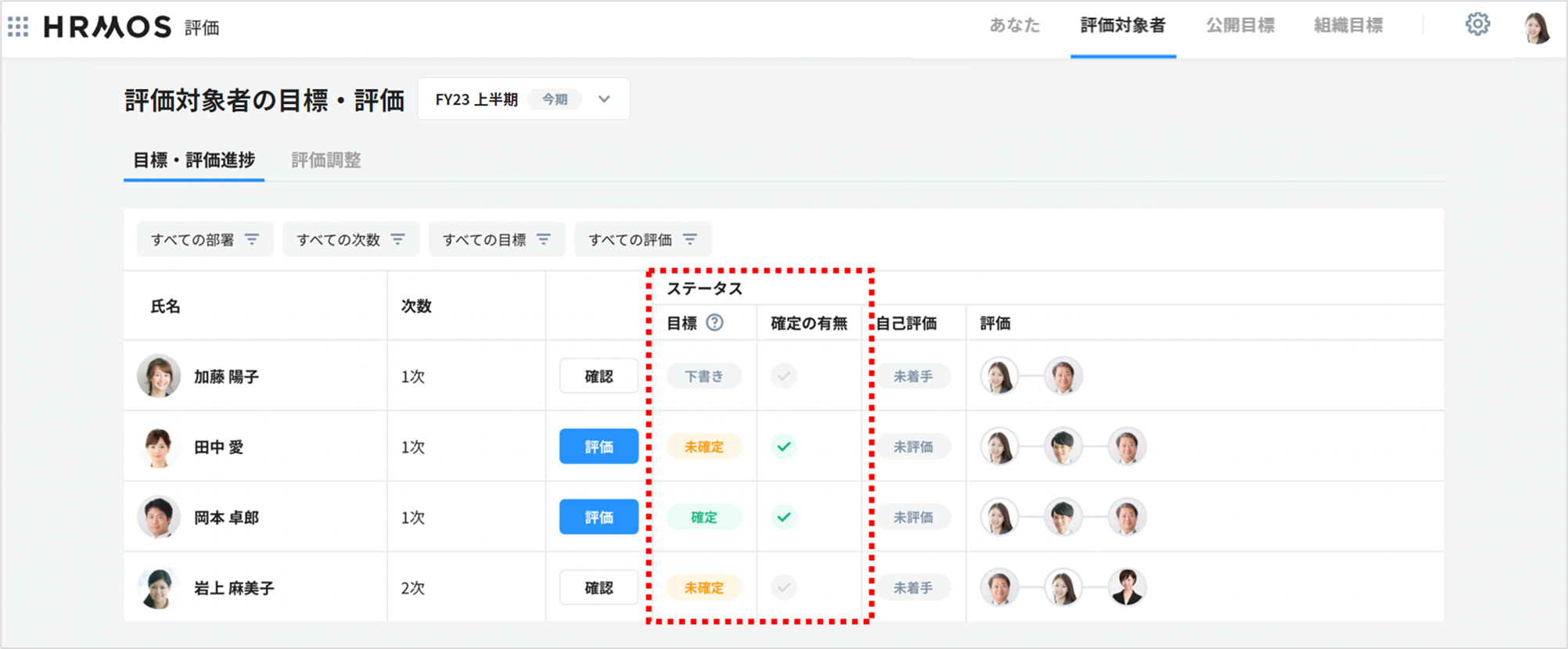 また、目標・評価のステータスごとに絞り込むこともできます。