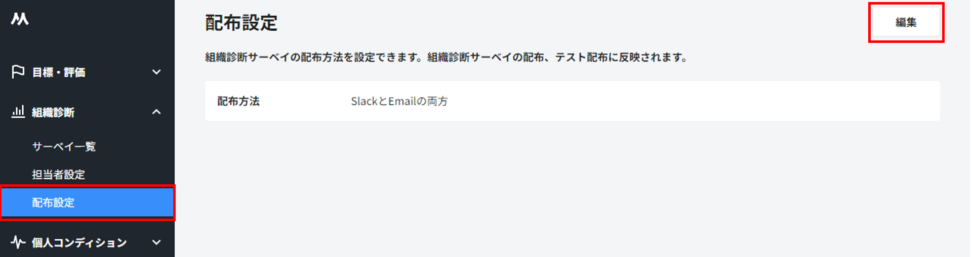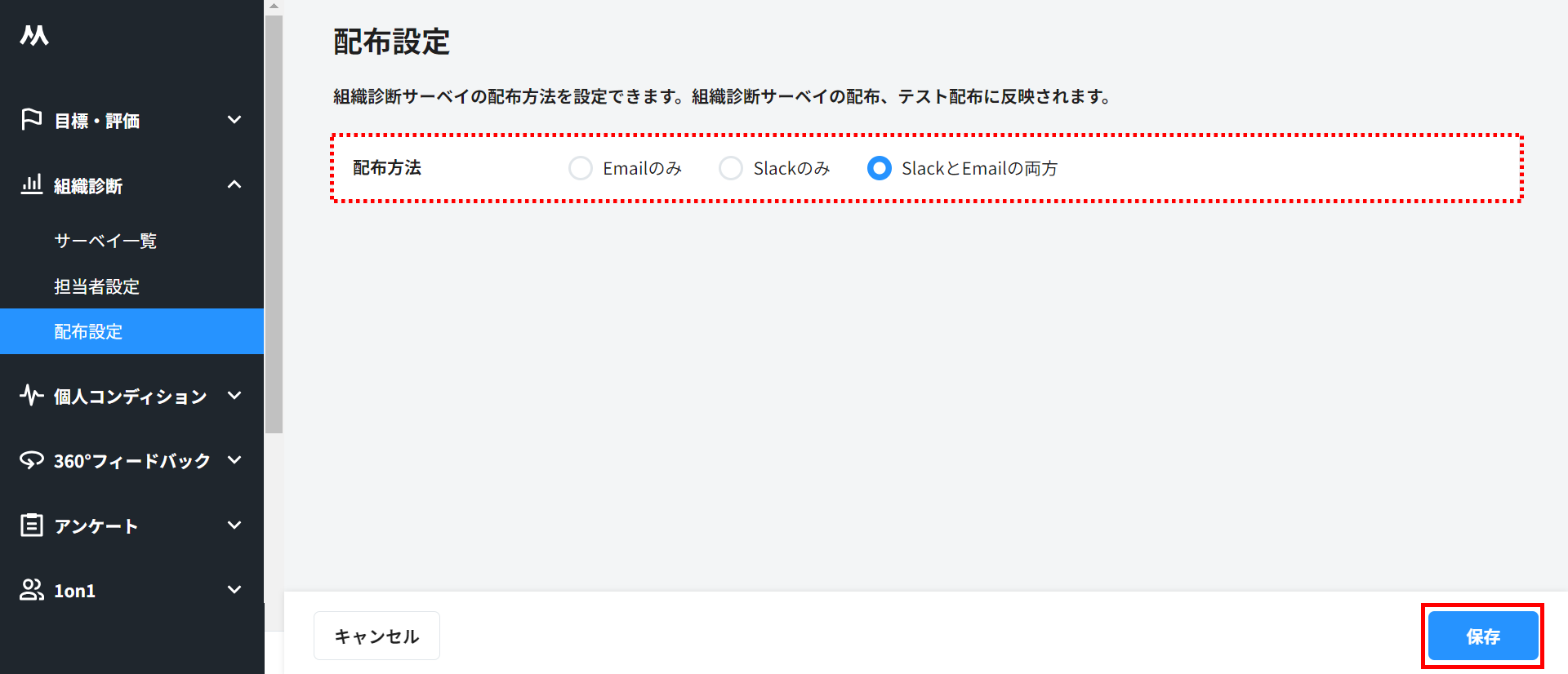 組織診断サーベイは、「Email」または「Slack」、あるいは「SlackとEmailの両方」から配布方法を選択することができます。