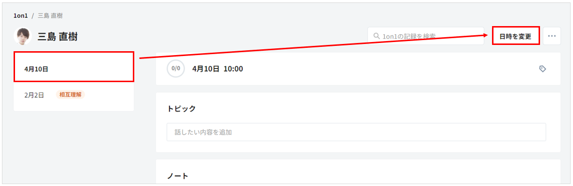 2. 最新の 1on1 の予定日を選択して、右上の「日時を変更」をクリックします。