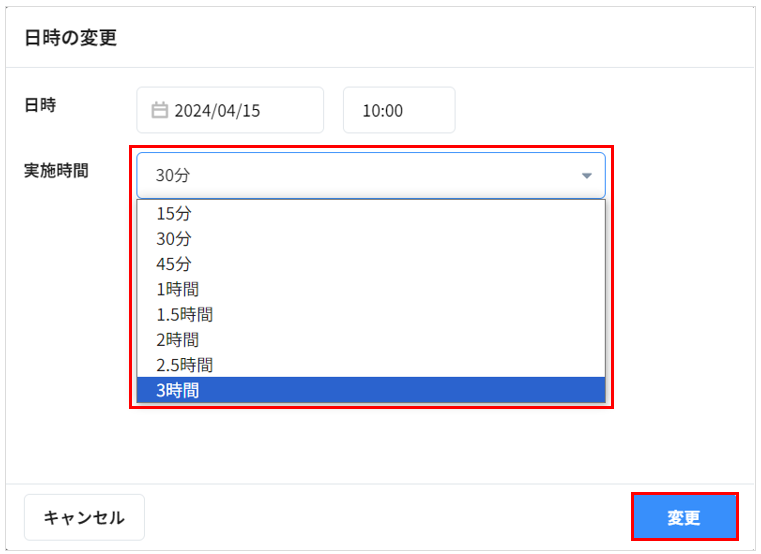 4. 実施時間はプルダウンから選択変更します。右下の「変更」をクリックして完了です。