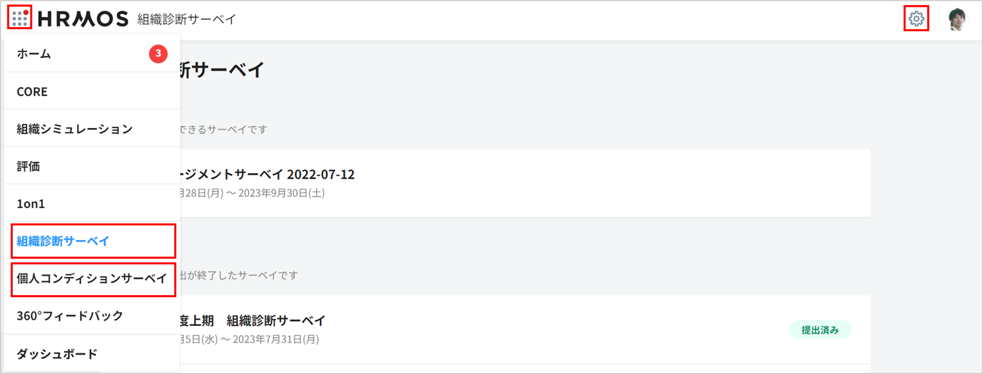 1. HRMOSにログインし、画面左上のランチャーアイコンから「組織診断サーベイ」または「個人コンディションサーベイ」を選択します。