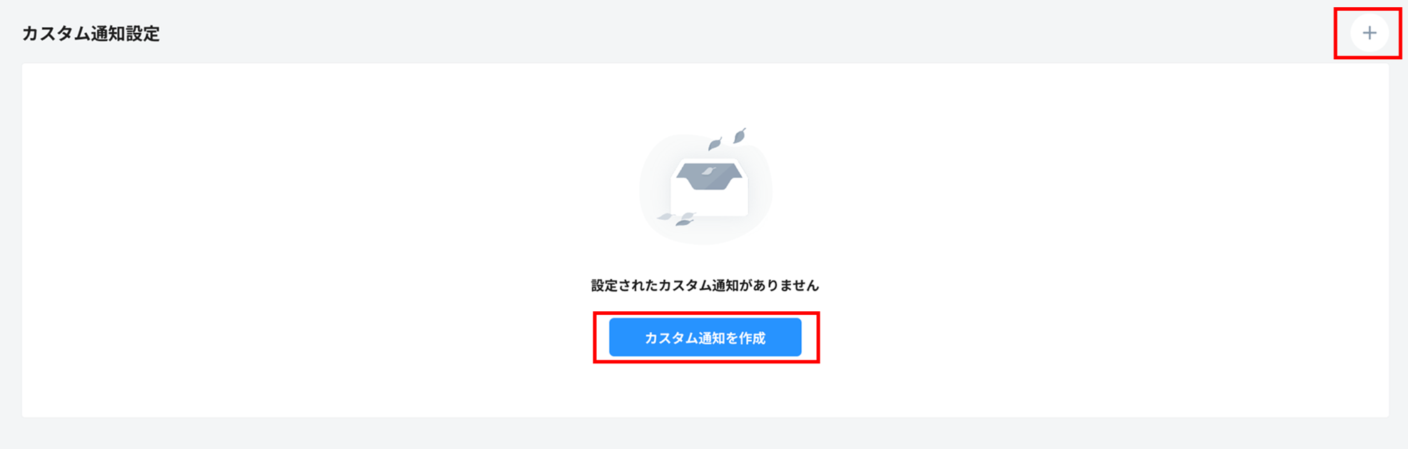 2. 画面右上の「+」ボタン、もしくは1件も作成していない場合は「カスタム通知を作成」をクリックします。