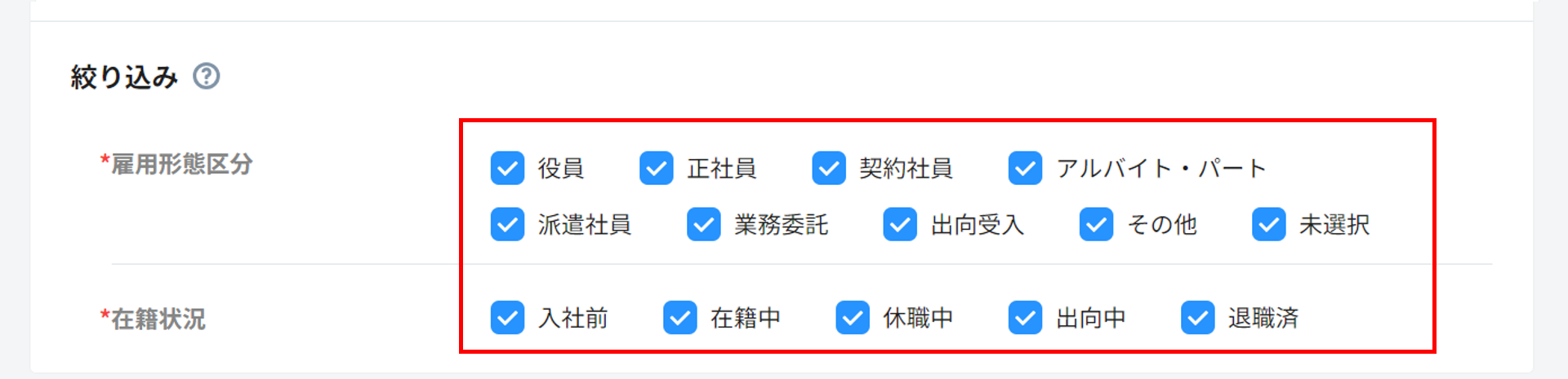 雇用形態区分と在籍状況のステータスのそれぞれについて、対象に含まない項目のチェックを外し、対象とする範囲の絞り込みを行います。