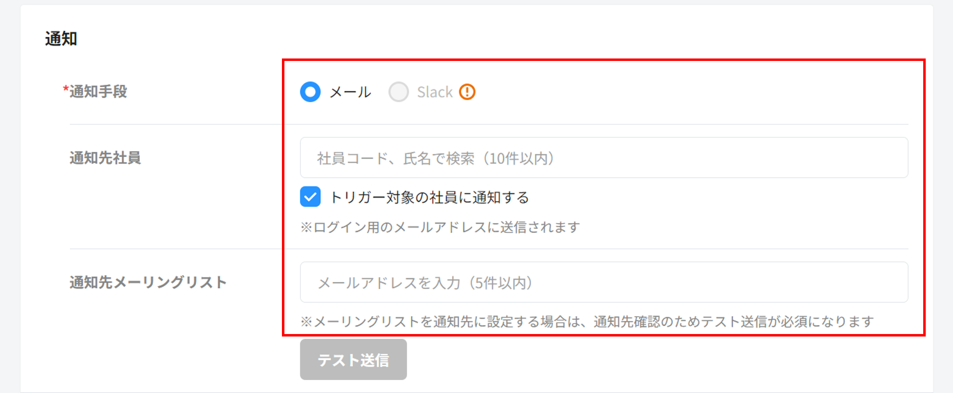通知手段:「メール」または「Slack」を選択します。