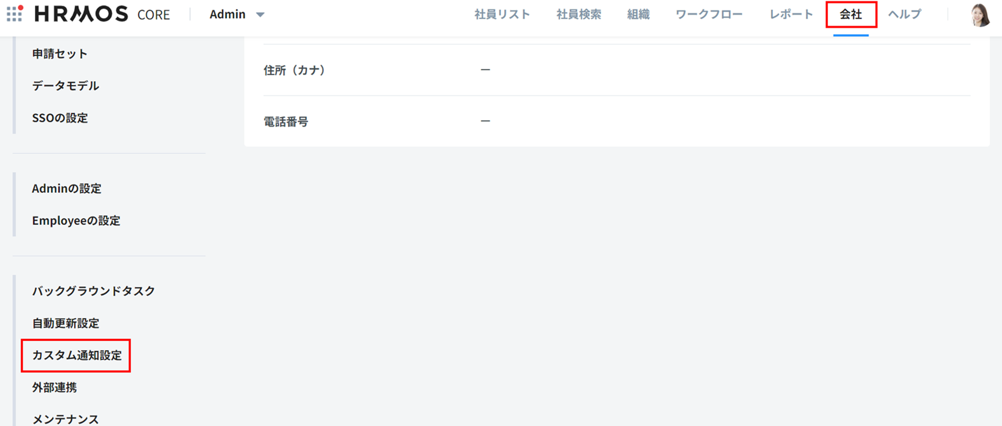 1. Admin>会社タブ>カスタム通知設定をクリックします。