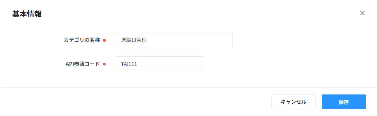 「カテゴリの名称」と「API参照コード」を入力し、右下の「保存」をクリックするとカテゴリが登録されます。