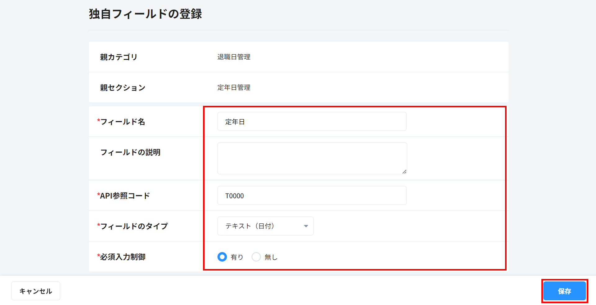 6. フィールドの登録画面にて項目を入力し、右下の「保存」をクリックすると、フィールドが登録されます。( ● は入力必須項目となります)