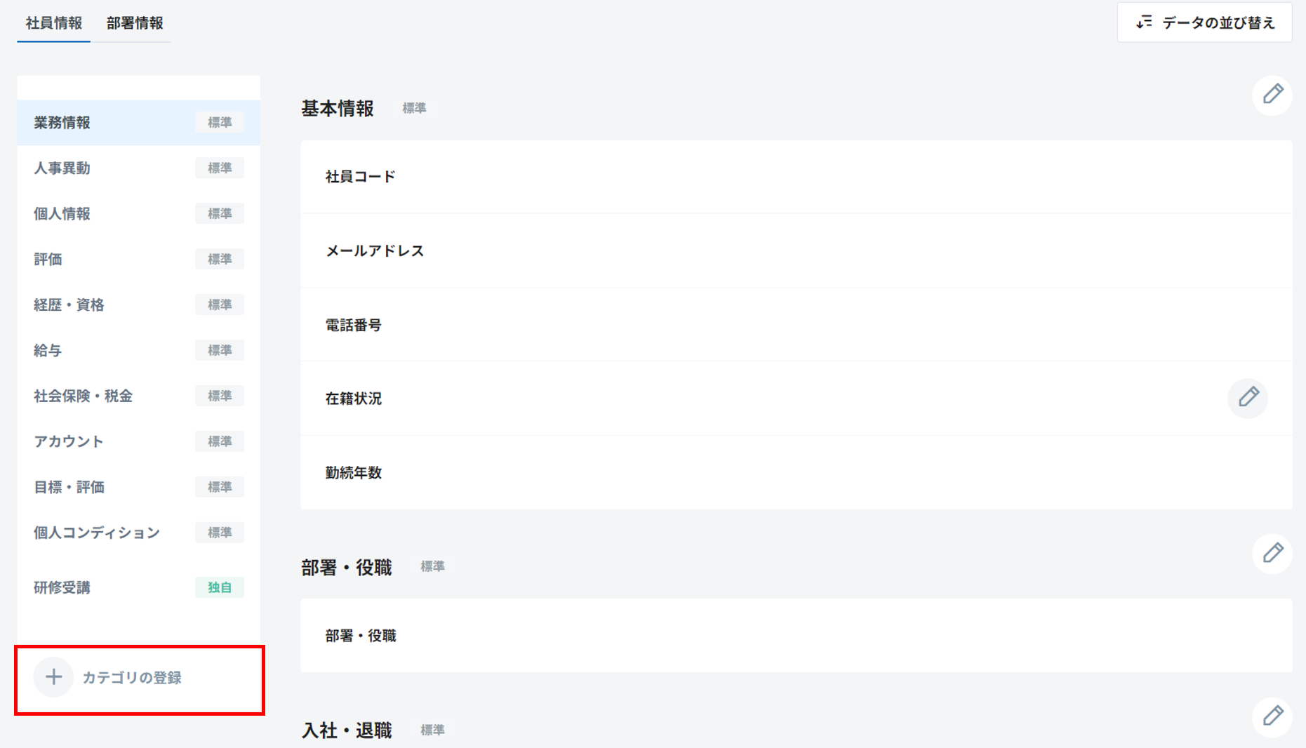 2. 社員情報の下部、「カテゴリの登録」をクリックします。