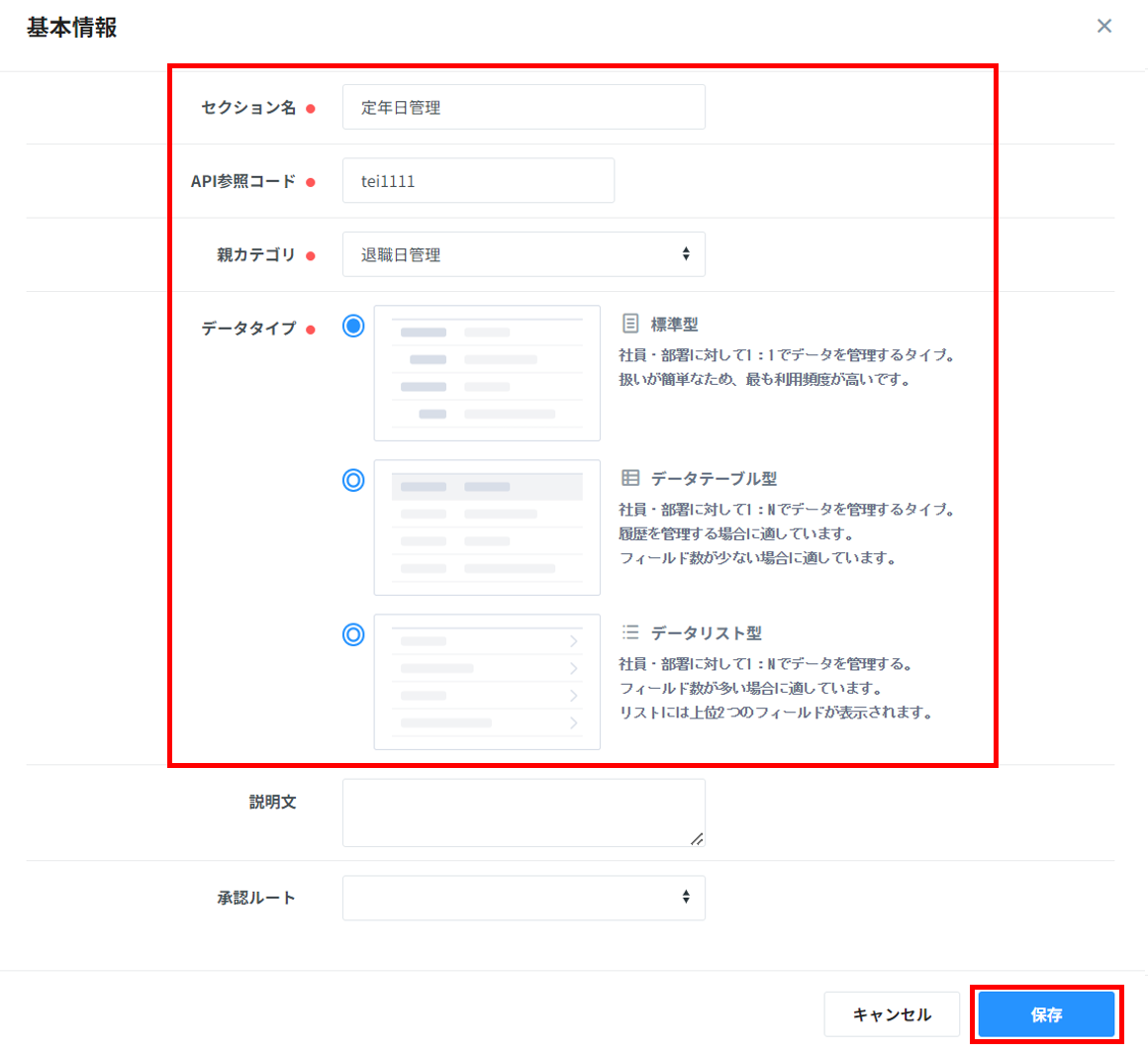 4. セクションの登録画面にて項目を入力し、右下の「保存」をクリックすると、選択した親カテゴリの配下にセクションが登録されます。( ● は入力必須項目となります)