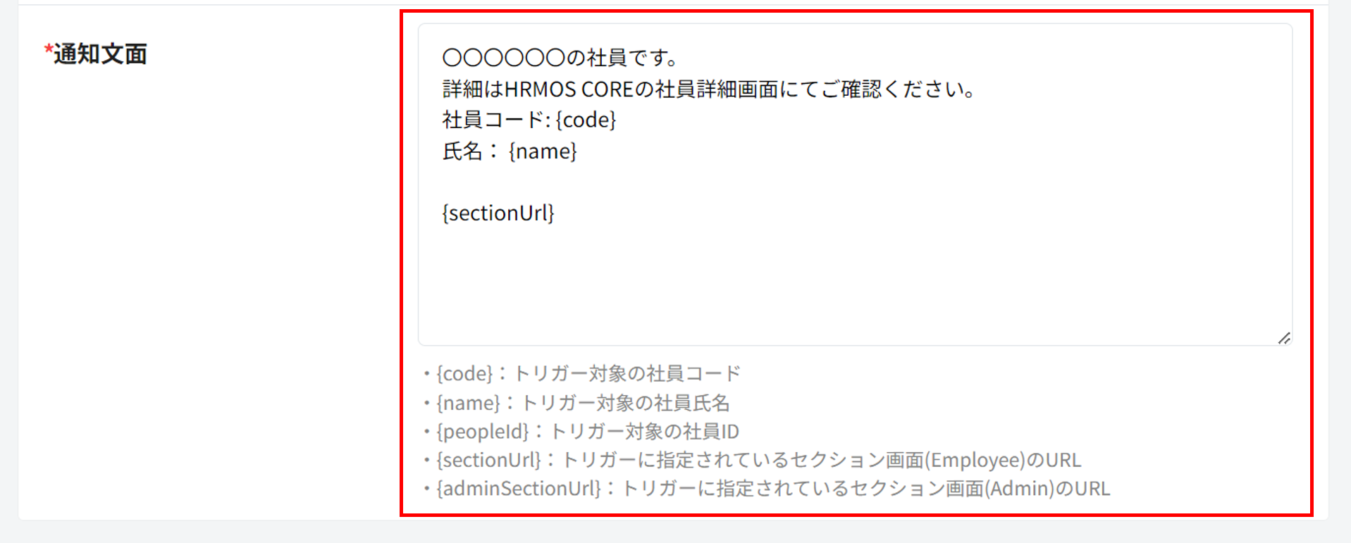 デフォルトで、トリガー対象に設定した社員の社員コード・氏名・トリガーに設定したセクションのURLが反映しています。必要に応じて編集してください。