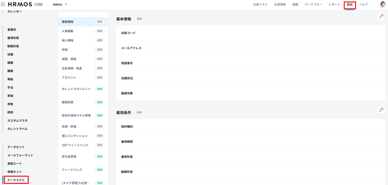 1. Admin(管理画面)にて「会社」タブ >「データモデル」をクリックします。