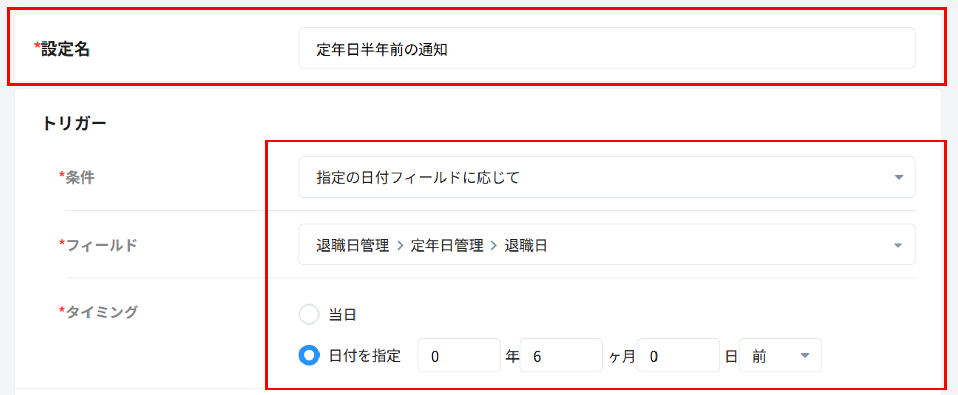 タイミング:日付を指定 6ヶ月前