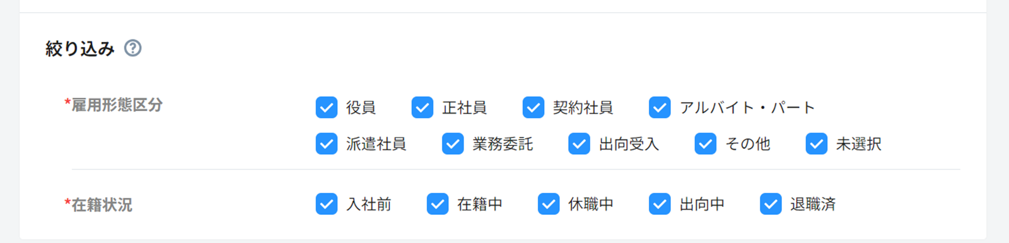 雇用形態区分と在籍状況のステータスのそれぞれについて、対象に含まない項目のチェックを外し、対象とする範囲の絞り込みを行います。