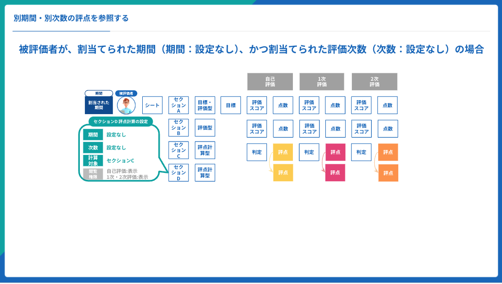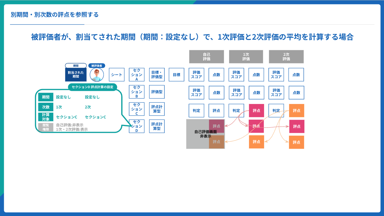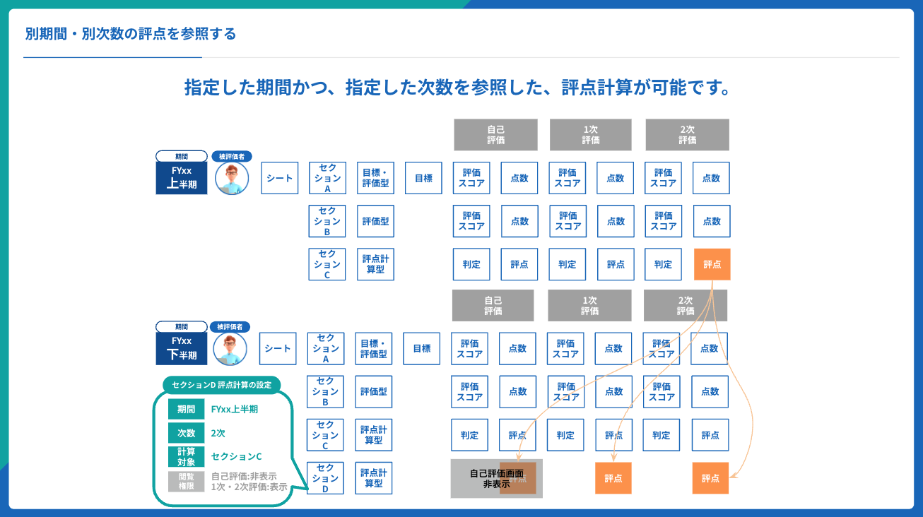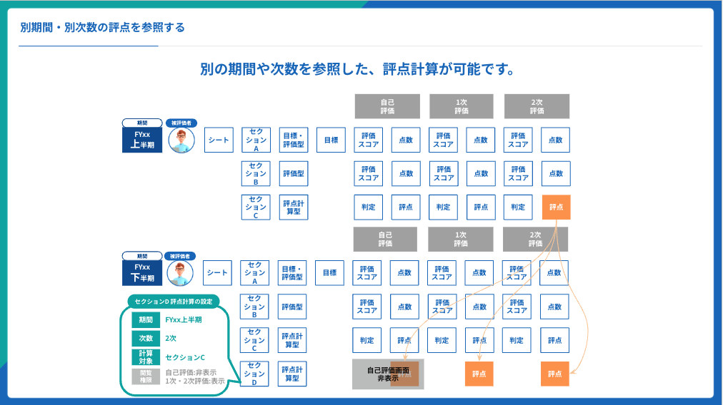 ・別の期を参照した評点計算を行い、昇格や昇給判断を行うことができる。
