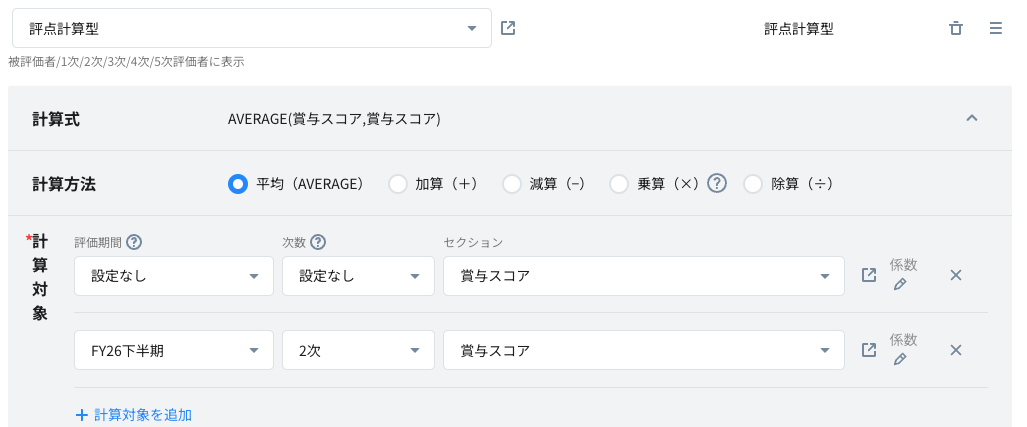 評価期間:上半期 次数:2次評価 計算方法:加算 を指定した場合