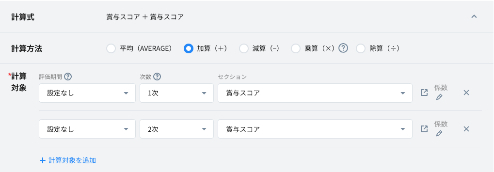 <例>評価期間:指定なし 次数:1次評価、2次評価 計算方法:加算 を指定した場合