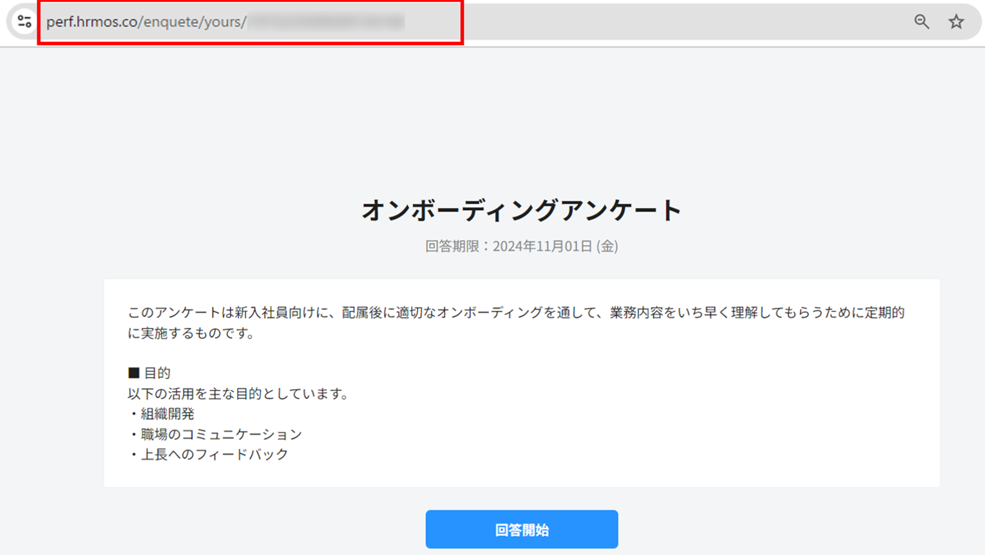 アンケートを配布する際に、回答対象者にURLを共有いただくことで、回答対象者が回答画面に直接遷移することが可能です。