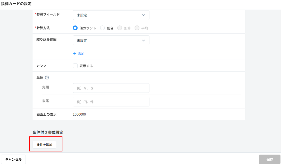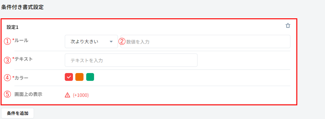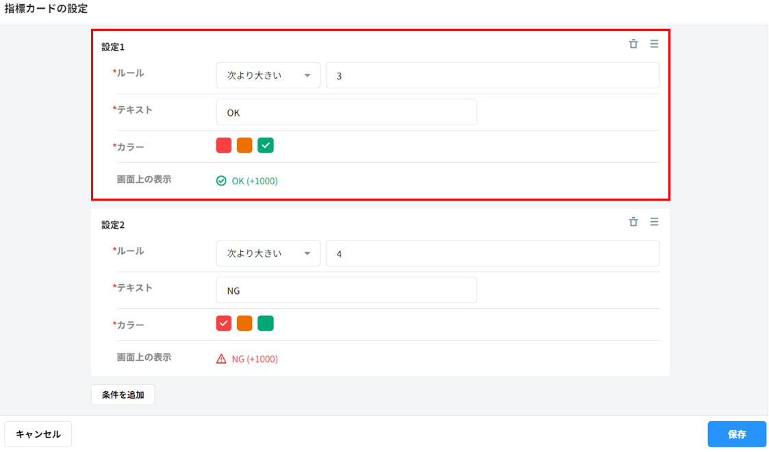 2. 指標カードの設定 > 条件付き書式設定 > 条件を追加 をクリックします。3. 「ルール」「数値」「テキスト」「カラー」を設定します。