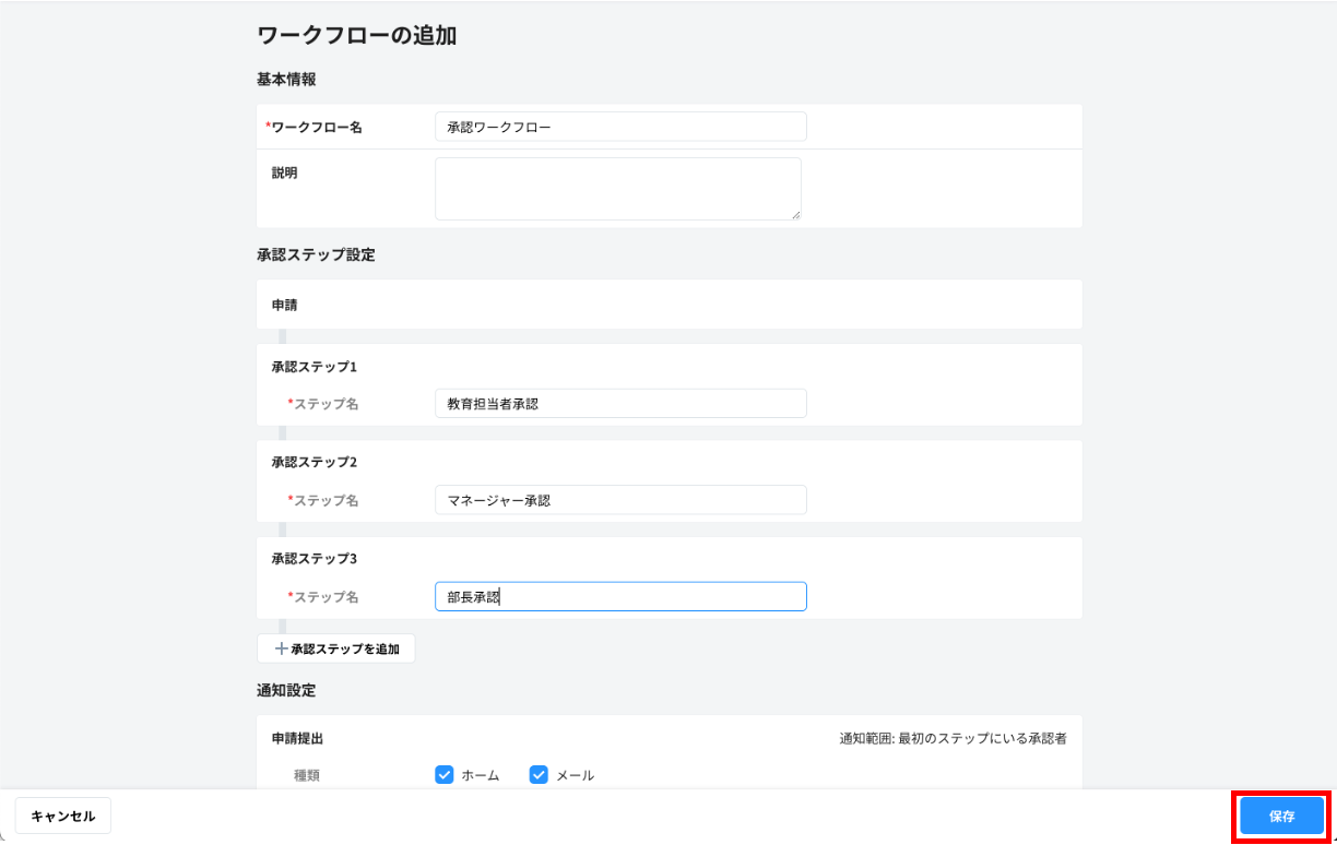 画面内にある入力項目を埋めて「保存」をクリックすると、ワークフローが追加されます。