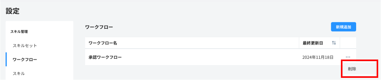1. ワークフローの一覧画面で、削除したいワークフローの右側のメニュー > 「削除」をクリックする