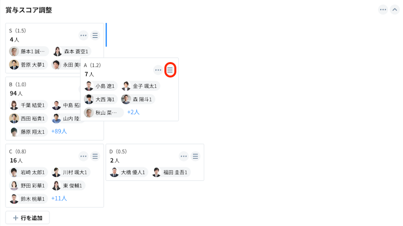 「+n人」をクリックすることで、カードに含まれるすべての被評価者が表示可能です。 |