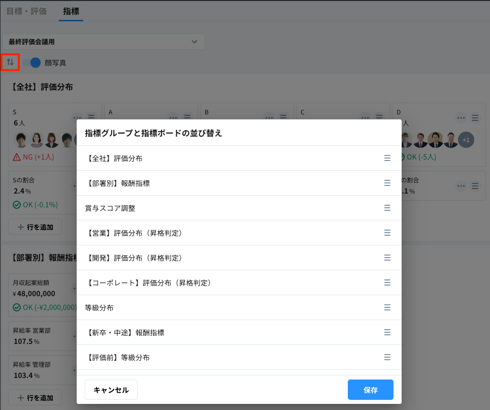 並び替えアイコンから、指標ボードとグループの並び替えが可能です。
