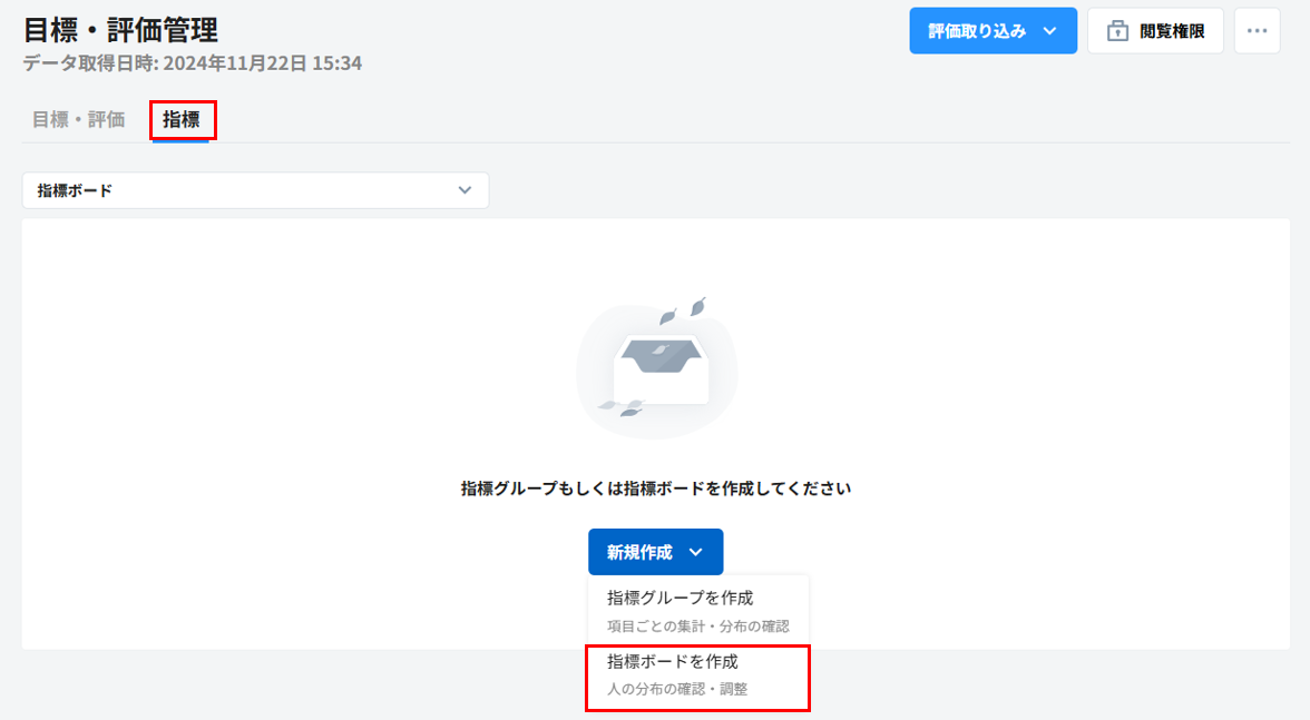 HRMOS目標・評価 > 管理画面 > 評価期間を選択 > 目標・評価管理タブ >「指標」を選択し、「指標ボードを作成」をクリックします。