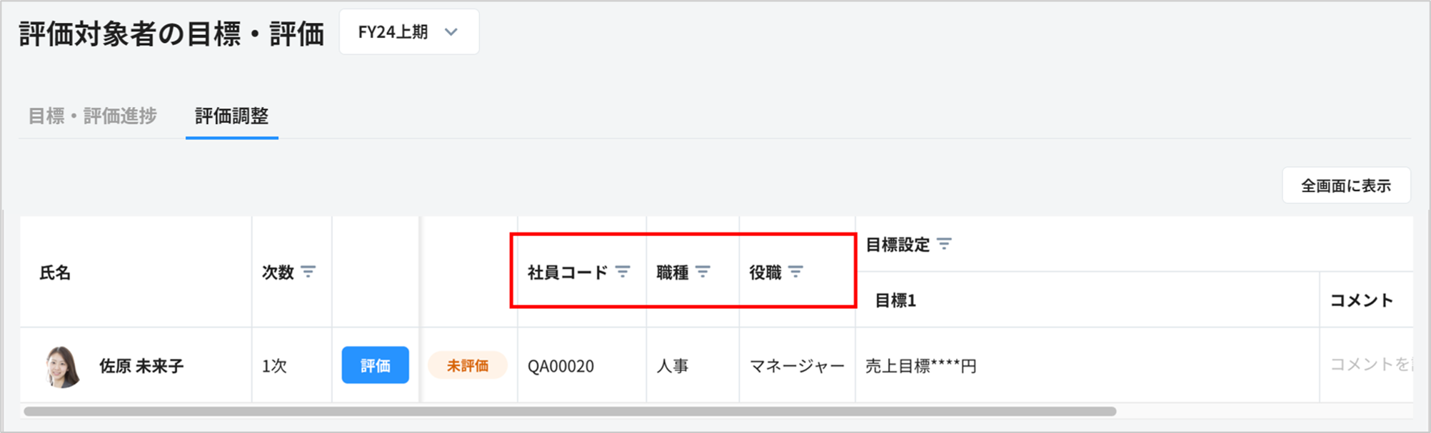 3. 評価者の評価調整画面に、各項目が表示されます。