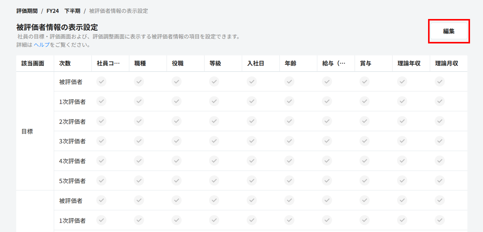 1. 管理画面 > 該当の期間 > 被評価者情報をクリックし、右上の「編集」ボタンをクリックします。