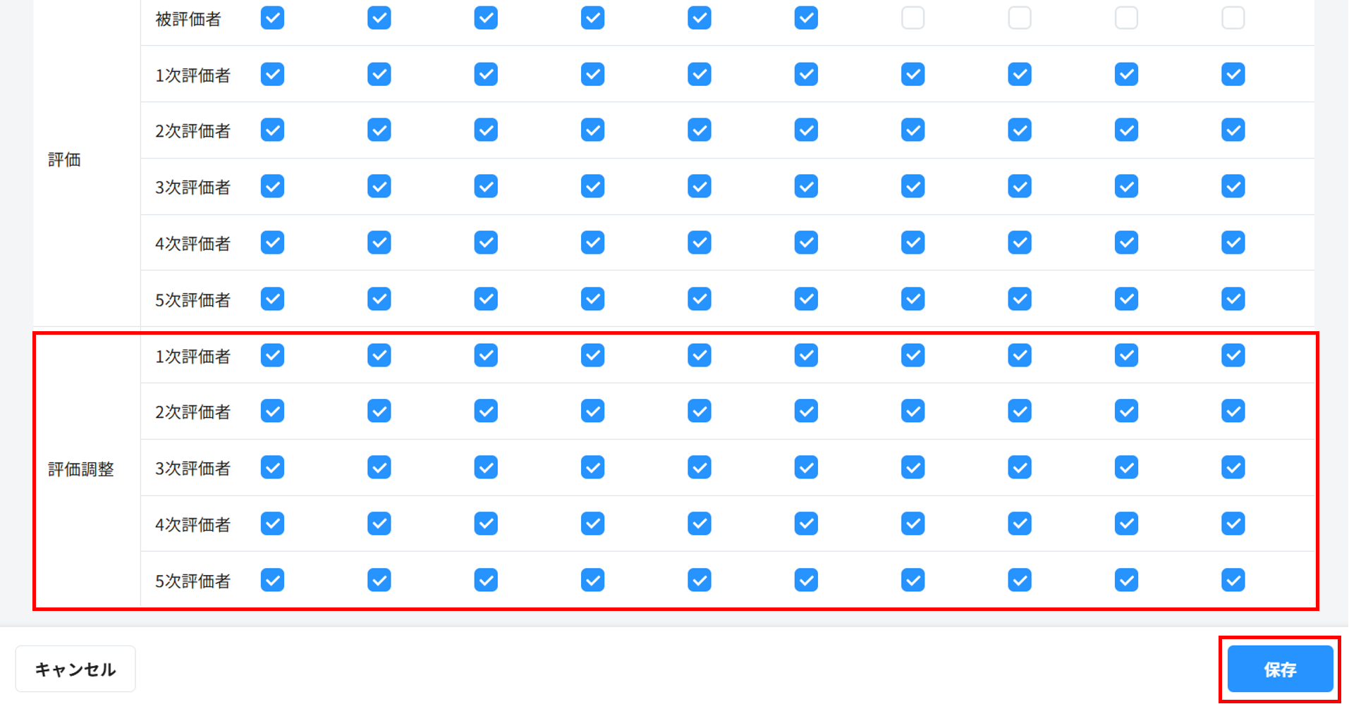 2. 「評価調整」について「次数」ごとに、表示させる項目にチェックをし、右下の「保存」をクリックします。