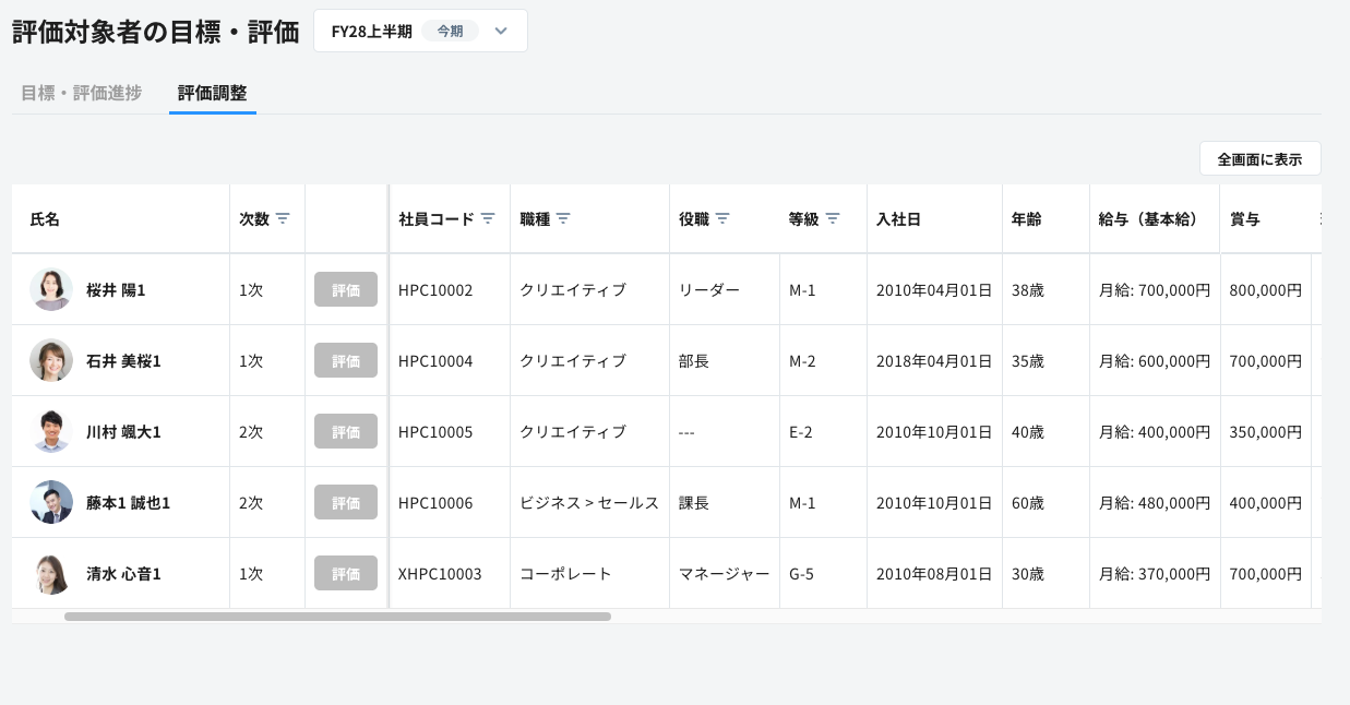 ※「評価調整」画面とは・・・評価者の配下メンバーの評価を一覧で表示している画面です。