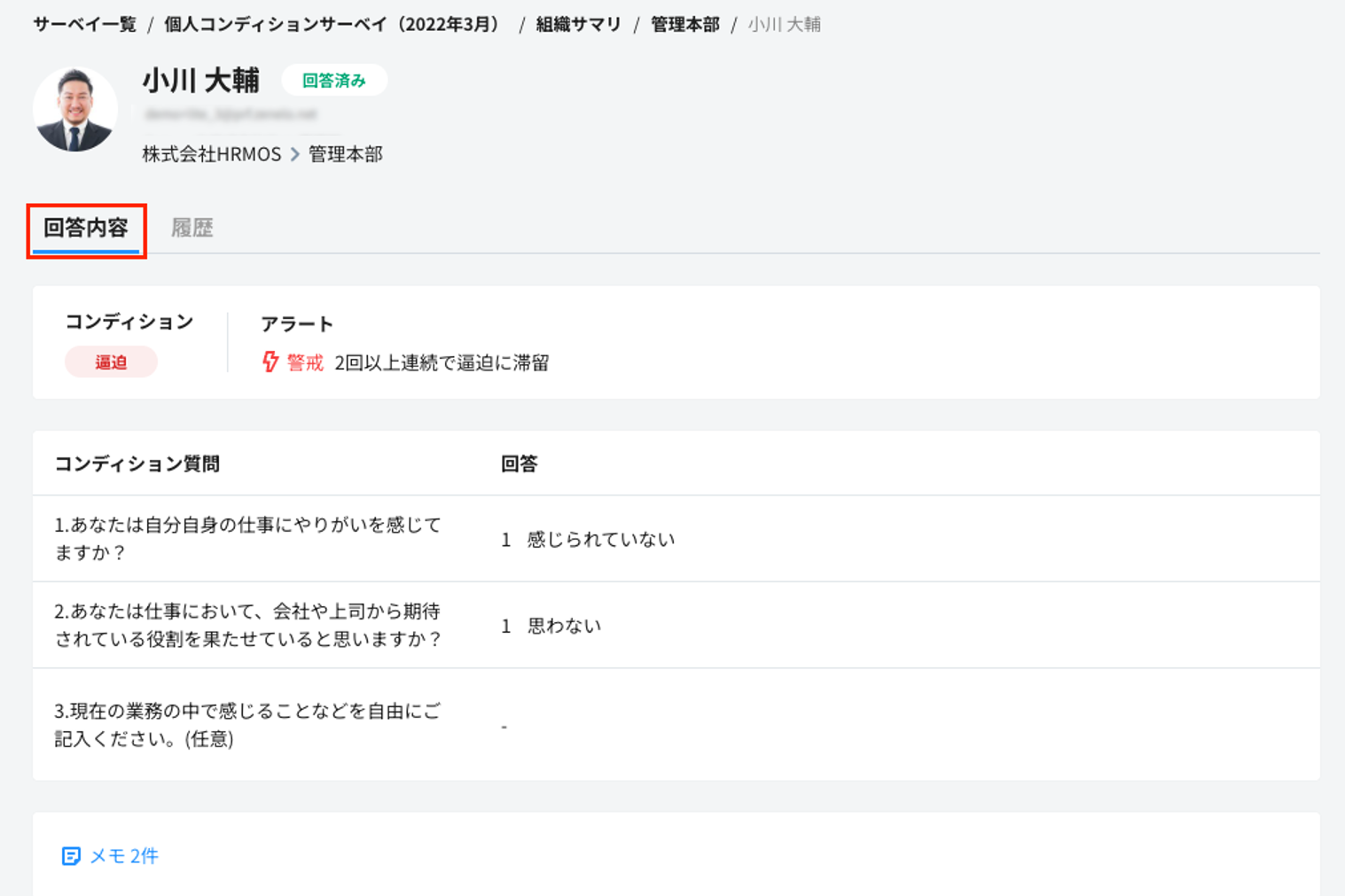 メンバー回答タブをクリックすると、「回答状況」「コンディション」「アラート」「各質問への回答と前回比」「メモの有無」を確認することができます。