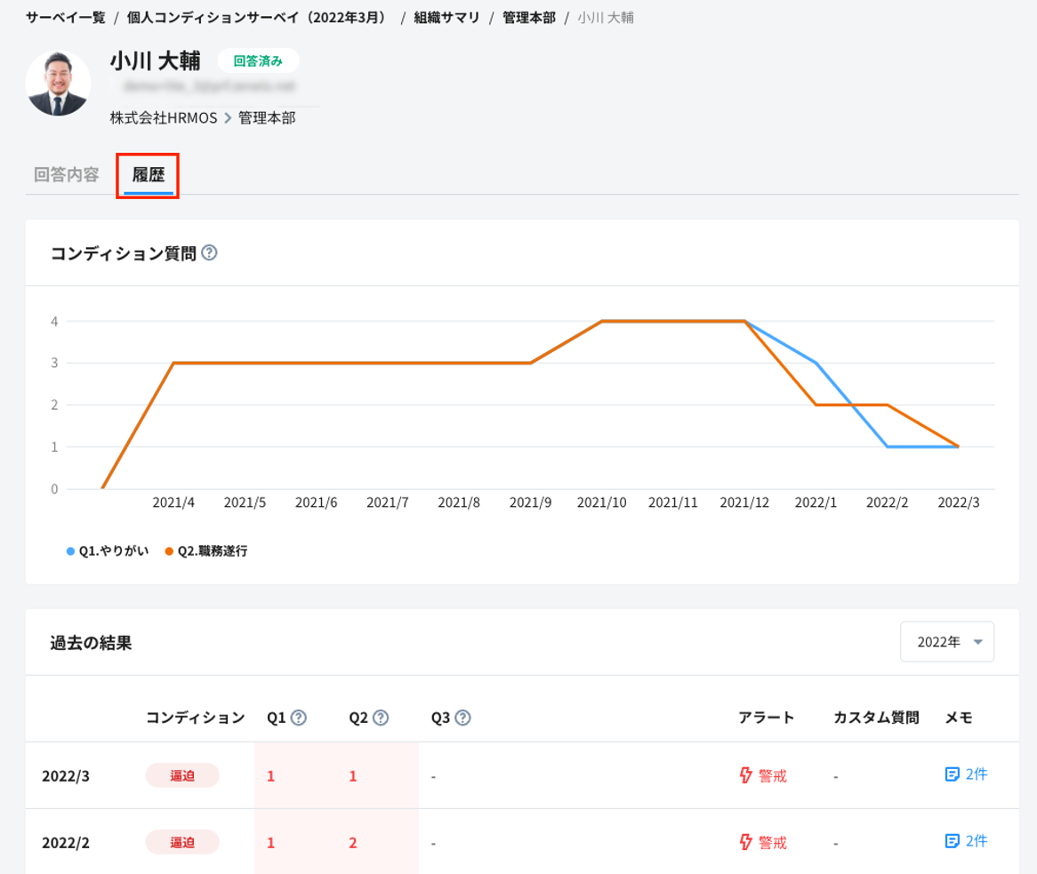 該当の従業員について、現在および過去の個人コンディションサーベイでの回答結果を閲覧することができます。