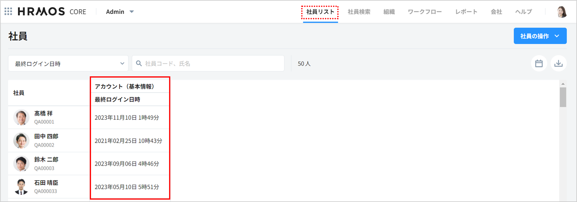 ユーザー別の最終ログイン日時情報は、各社員の社員詳細画面 > カテゴリ「アカウント」> セクション「基本情報」の「最終ログイン日時」にてご確認いただけます。