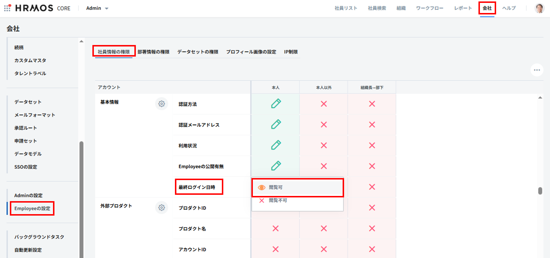 Employee(社員画面)における「最終ログイン日時」の閲覧権限は、Admin(管理画面)>「会社」タブ >「Employeeの設定」にて設定が可能です。
