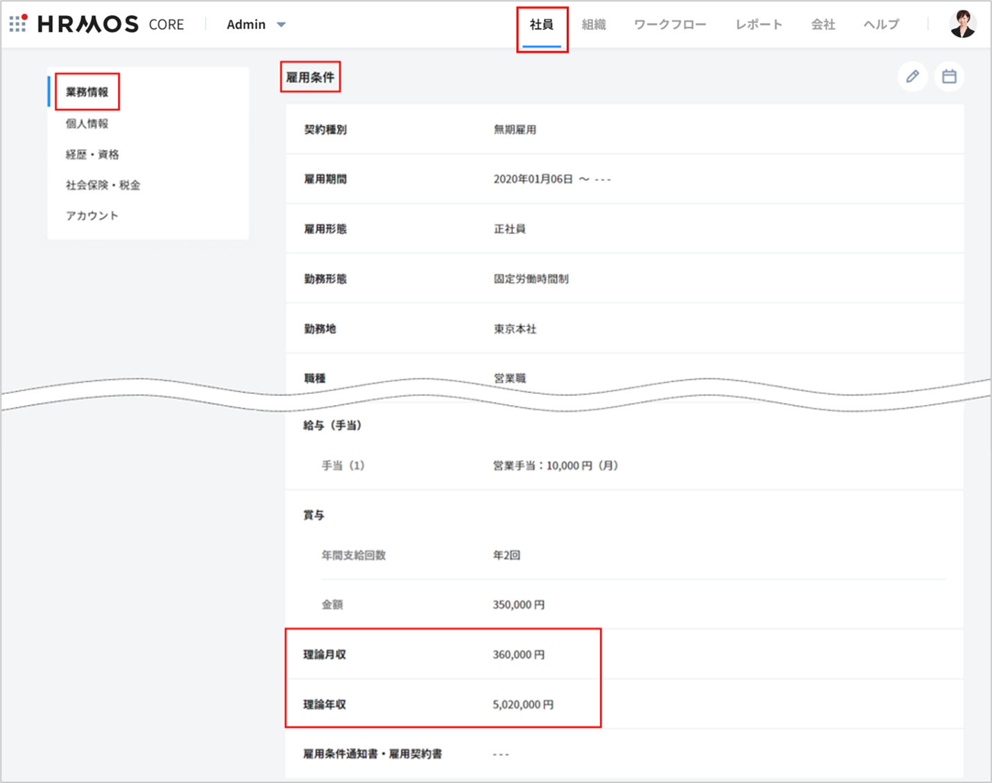 「理論月収」「理論年収」は、社員詳細画面のカテゴリ「業務情報」> セクション「雇用条件」にて表示されます。