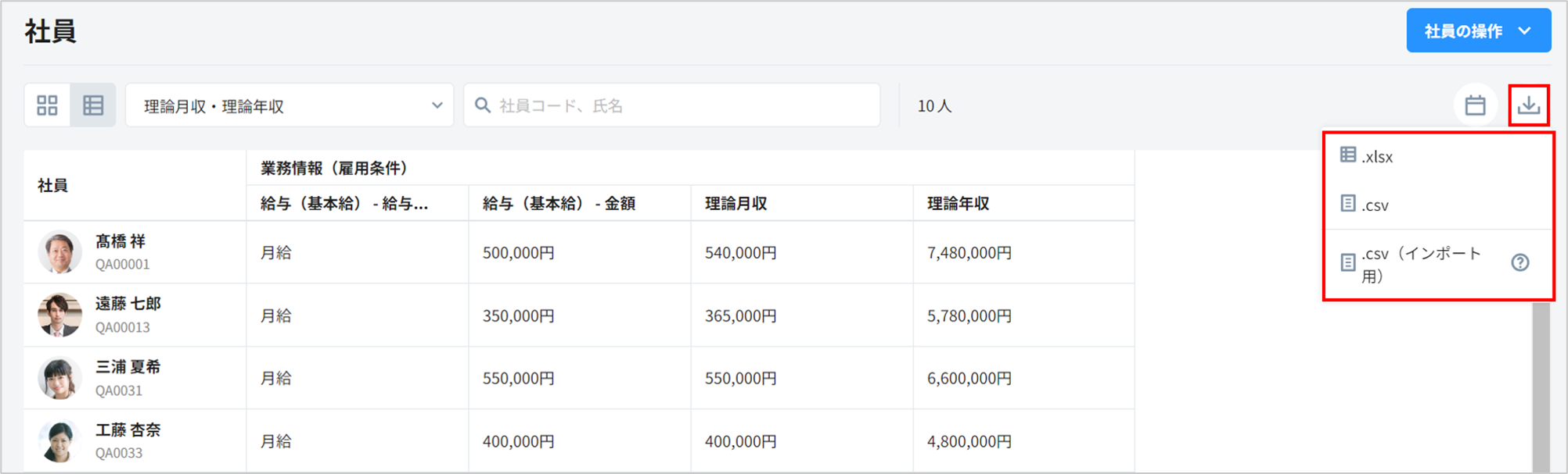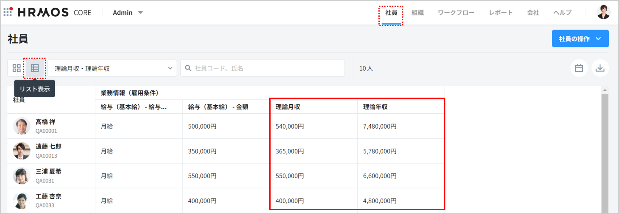社員一覧のリスト表示において、データセットを作成することで「理論月収」「理論年収」を表示できます。