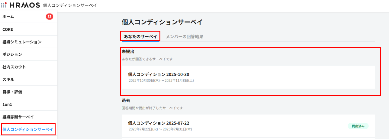 個人コンディションサーベイ > あなたのサーベイの画面では、個人コンディションサーベイの回答/回収期間のステータスに応じて、未提出/過去に振り分けが行われます。