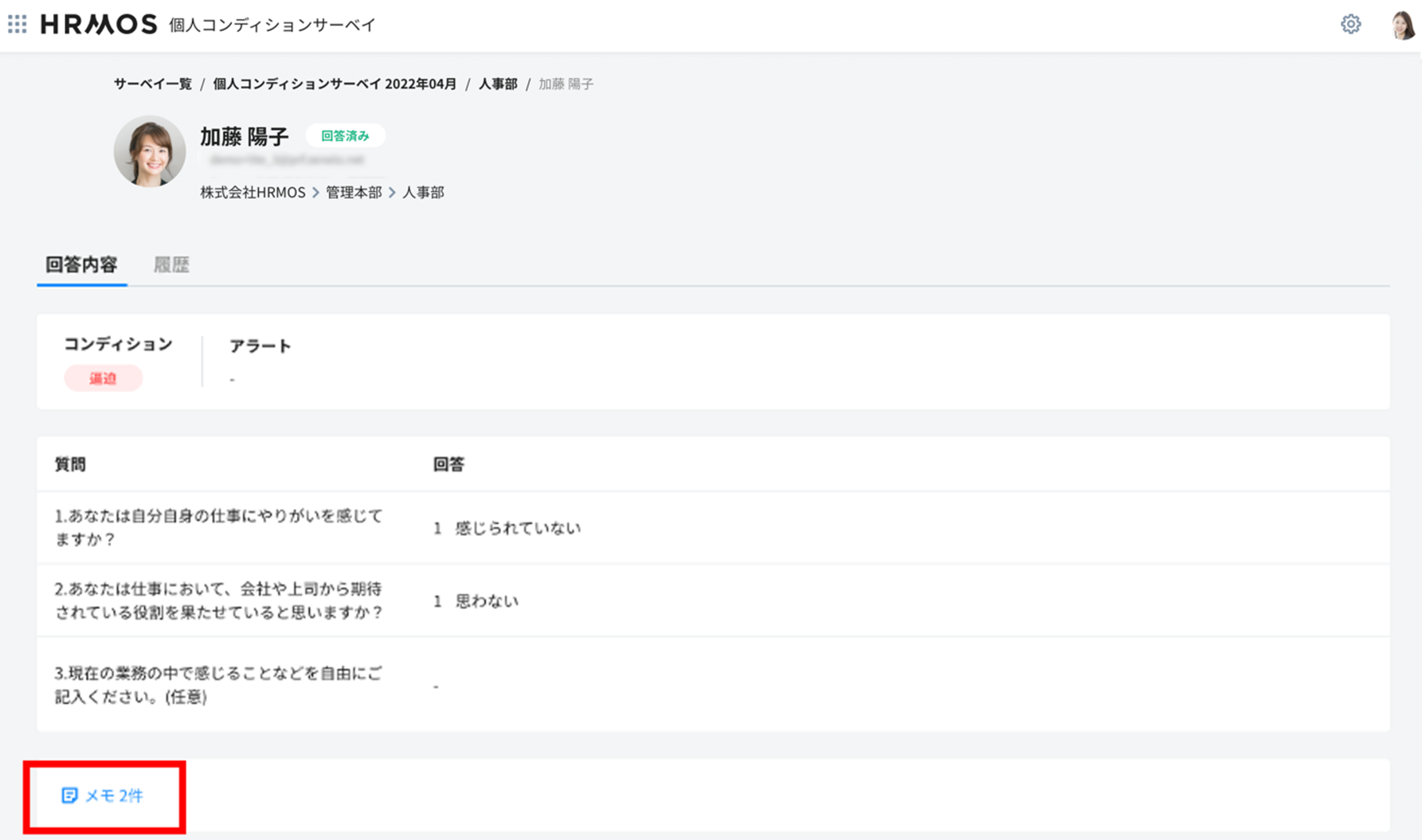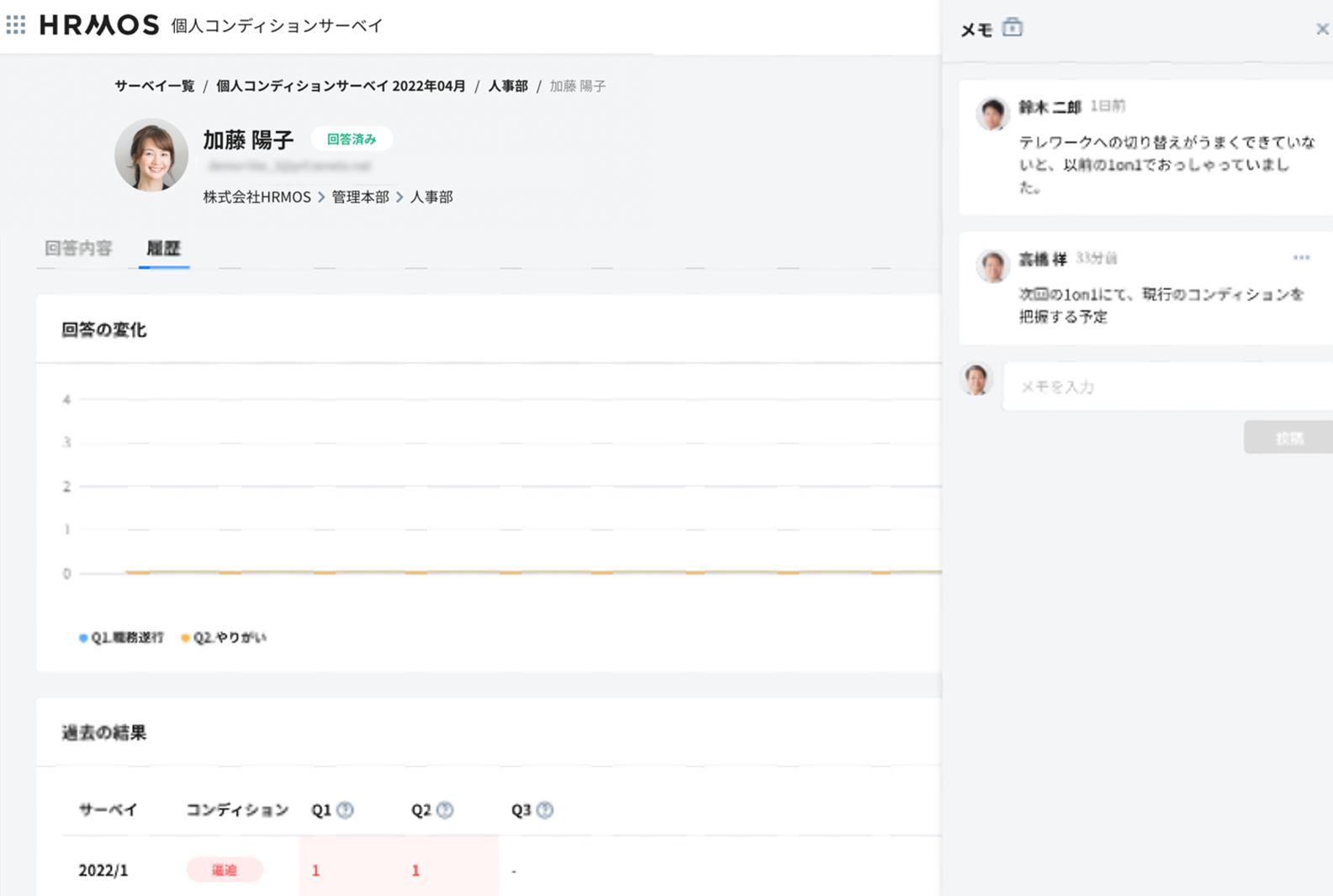 「組織長」は、個人コンディションサーベイの各メンバーの回答に対して、メモを残すことができます。